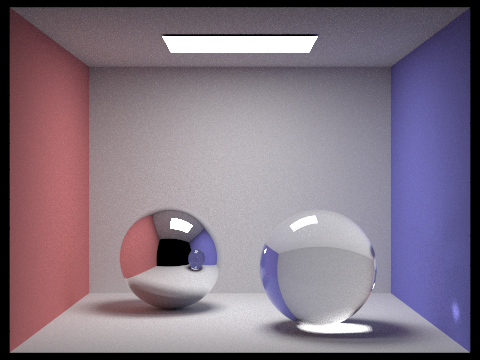 In order to emulate glass properly, we had to combine both reflection and refraction in the BSDF function. To do this, we needed to know the ratio of the reflection energy to the refraction energy, which we calculated using Schlick's_approximation. The algorithm is as follows: First, decide if there is internal reflection, in which case we simply reflect our outgoing light vector into our inbound vector. If there is not, we use Schlick's approximation to calculate our energy ratio and then randomly decide, with the ratio as the probability, to either reflect or refract the light ray.