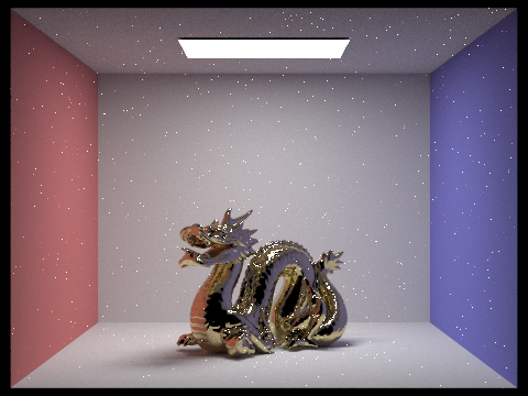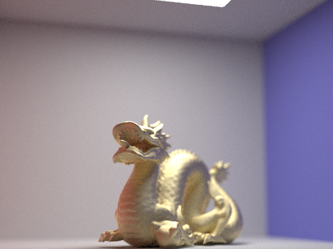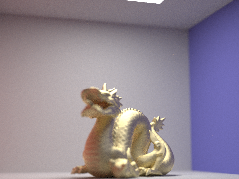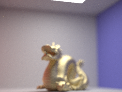 The four pictures below are the gold microfacet dragon with a roughness of 0.5. The aperture remains constant throughout each image, but the focus changes. Notice how changes in focal length lead to blurriness in various parts of the image: At a focal length of 0.25, nothing is in focus. At 0.30, only the front of the dragon enters the plane of focus. At a focal length of 0.35, the front of the dragon is no longer in focus, but the back half is. At 0.45, none of the dragon is focused anymore, but the back wall of the cornell box is.
