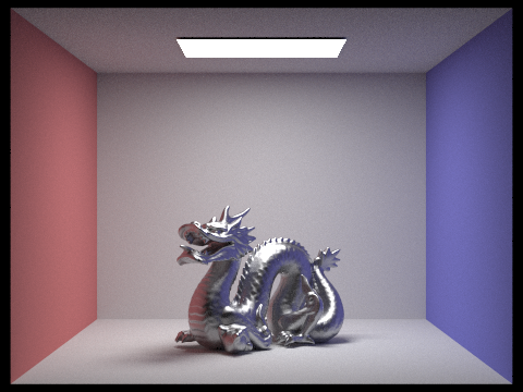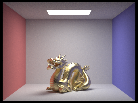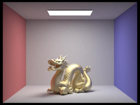 The dragon in the four images below contains a gold microfacet material. Notice as the roughness of the material increases, the dragon increases in brightness. This is due to the greater distribution of surface normals, leading to more reflections against itself. However, it also becomes less metallic and glossy, instead looking more similar to a diffuse material.