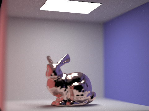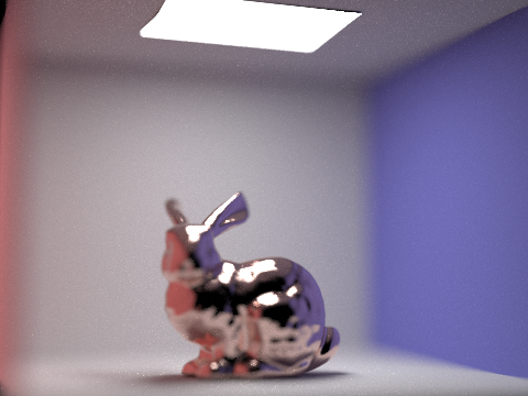The next four pictures are of the copper microfacet bunny. Each image has the same focal length, but the aperture varies between them. At an aperture of 0, we simulate a pin-hole camera, which we have been using up to now, and everything in the frame comes into focus. At an aperture of 0.125, the walls of the cornell box start to blur while the bunny remains in focus. At higher levels, parts of the bunny begin to blur as well until only a portion of the head and upper back are in focus.